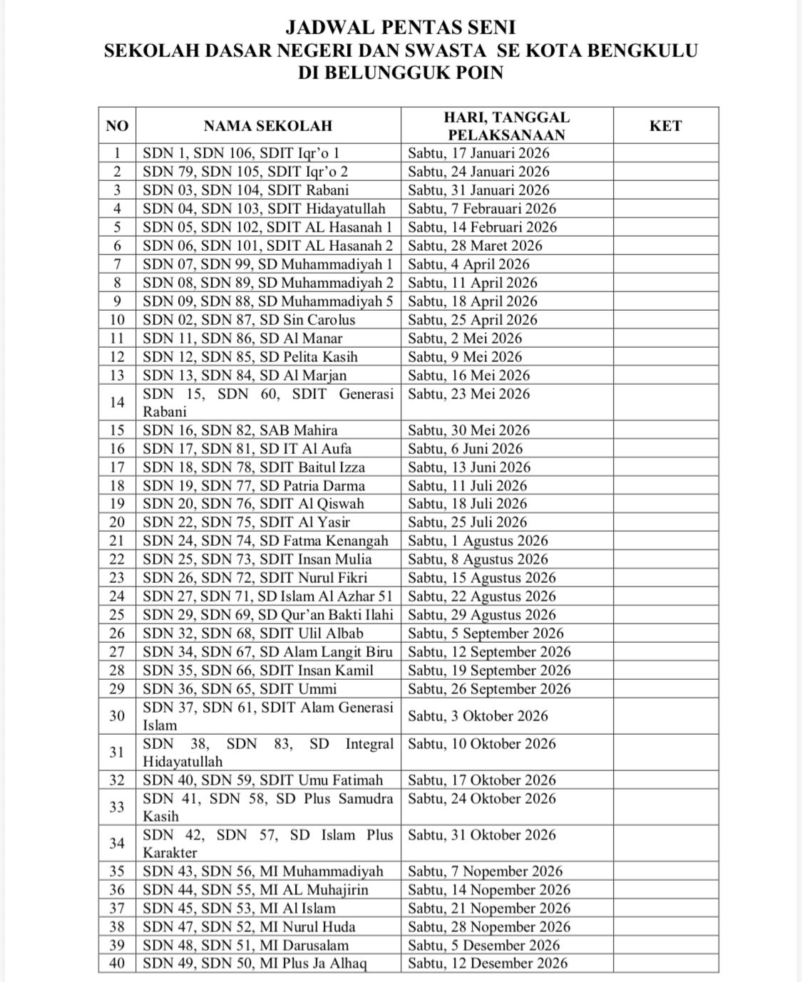 Plt Kepala Dinas Pariwisata Kota Bengkulu, Nina Nurdin, mengonfirmasi bahwa jadwal rangkaian acara pentas seni untuk setiap malam Minggu (Sabtu malam) di Belungguk Poin saat ini sudah penuh terisi oleh para peserta.