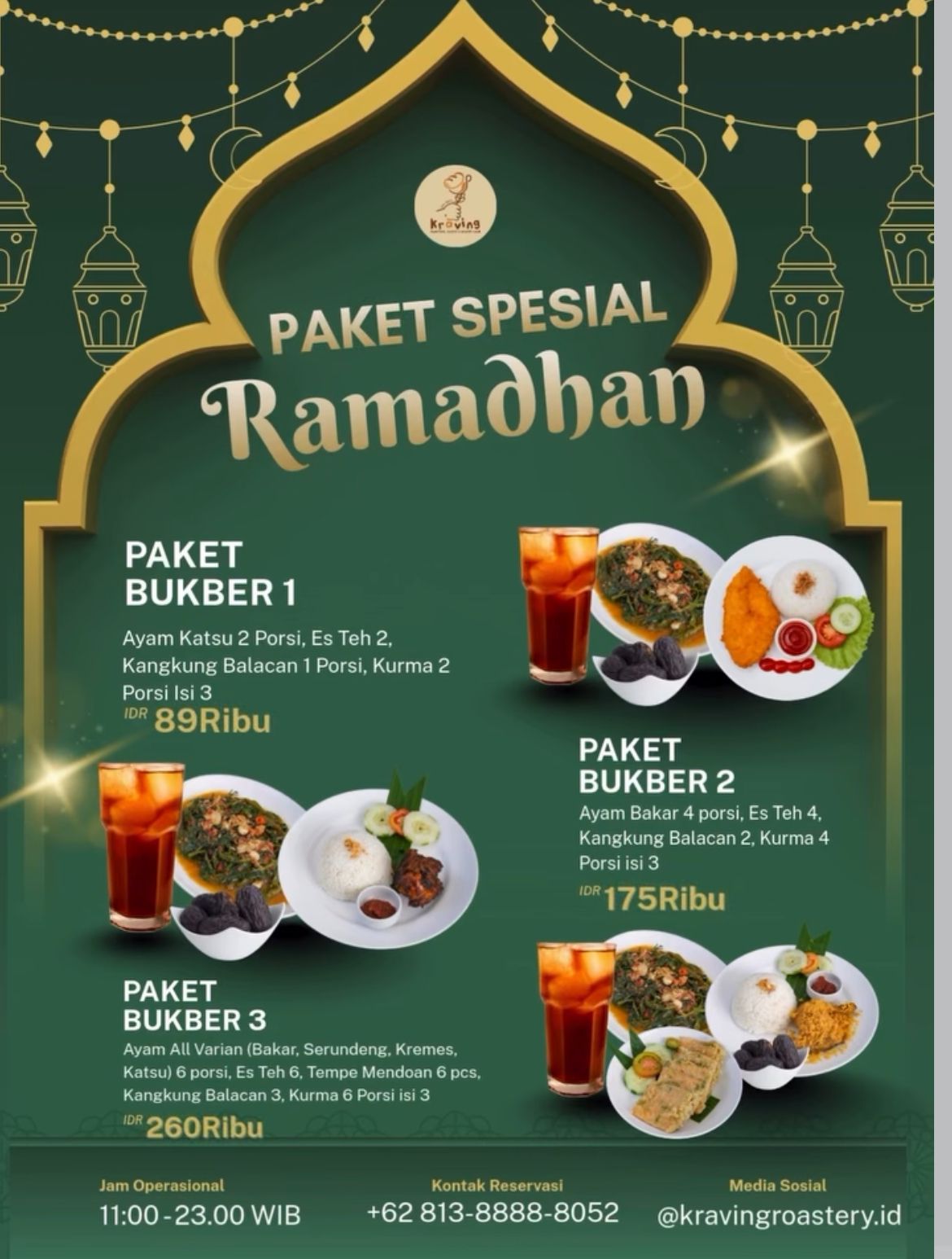 Bagi masyarakat yang mencari tempat ngabuburit sekaligus berbuka dengan menu nusantara yang autentik, Kraving Roastery menawarkan tiga pilihan paket utama: