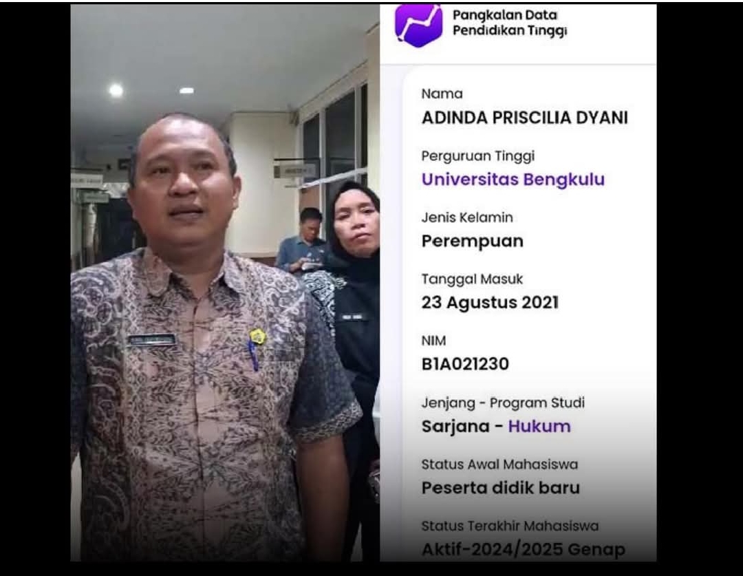 Pernyataan itu disampaikan menyusul sorotan publik yang menyeret nama kampus. Di tengah polemik itu, media ini menelusuri data Pangkalan Data Pendidikan Tinggi (PDDikti) yang menunjukkan seorang mahasiswi bernama Adinda Priscilia Dyani tercatat berstatus aktif di Program Studi Hukum Universitas Bengkulu pada semester 2024/2025 genap. Adinda Priscilia Dyani inilah yang disebut dan dipastikan terlibat dalam kasus penggelapan tersebut.