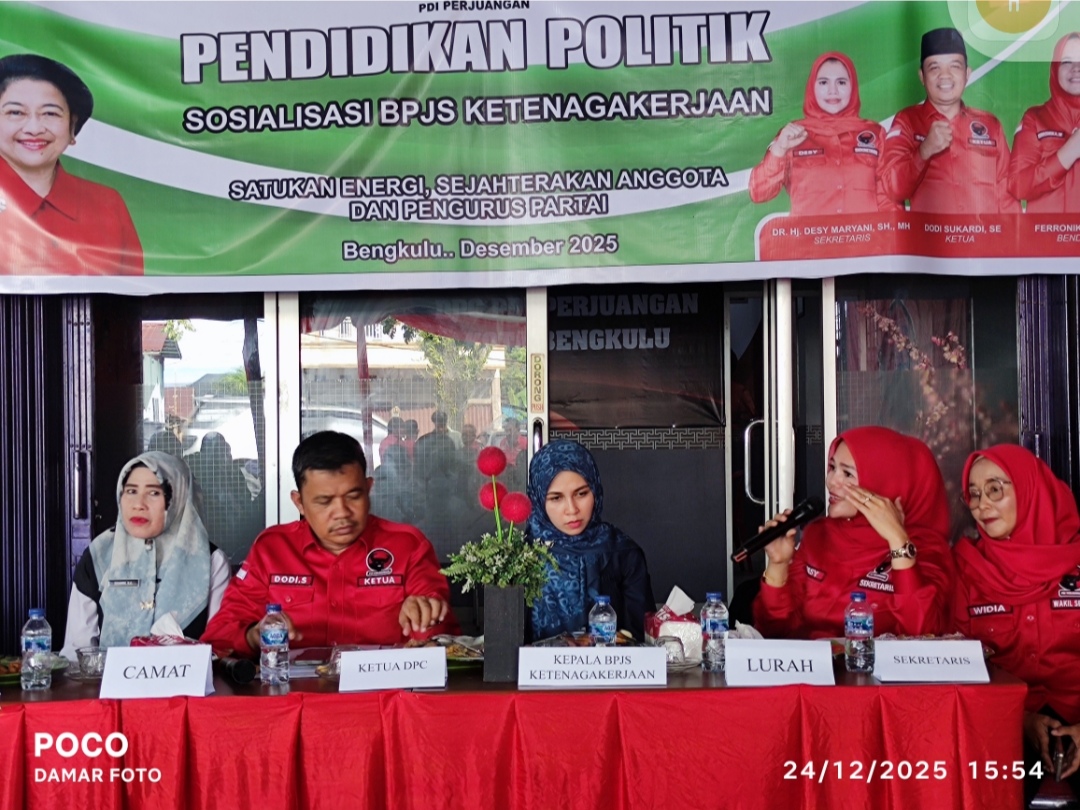 BENGKULU – Sekretaris DPC PDI Perjuangan Kota Bengkulu, Dr. Desy Maryani, S.H., M.H., mendampingi Ketua DPC PDI-P Kota, Dodi Sukardi dan Bendahara Vera serta pengurus menggelar rangkaian kegiatan sosialisasi program kemasyarakatan yang menyasar sektor pendidikan dan jaminan sosial bagi warga Kota Bengkulu pada Rabu (24/12/2025).