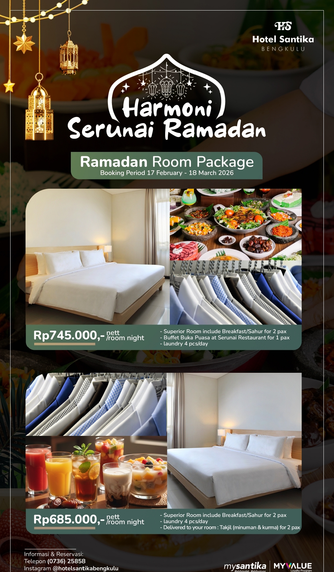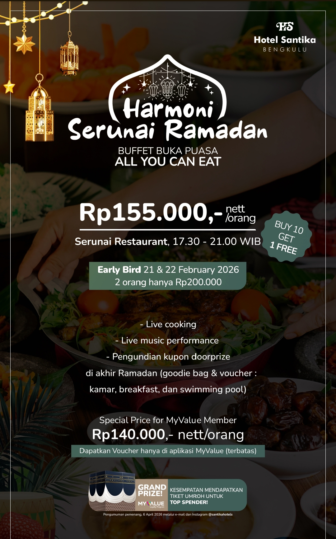 Khusus bagi MyValue Member, tersedia harga spesial Rp140.000,- nett/orang. Voucher dapat diperoleh secara eksklusif melalui aplikasi MyValue dan tersedia dalam jumlah terbatas. Menambah kemeriahan Ramadan tahun ini, MyValue Loyalty Program juga menghadirkan kesempatan memenangkan Grand Prize tiket umroh untuk Top Spender. Pengumuman pemenang akan dilakukan pada 6 April 2026 melalui email dan Instagram resmi @santikahotels. Selama bulan Ramadan Hotel Santika Bengkulu menyediakan paket meeting room include berbuka puasa yang bisa dilakukan bersama partner kerja.