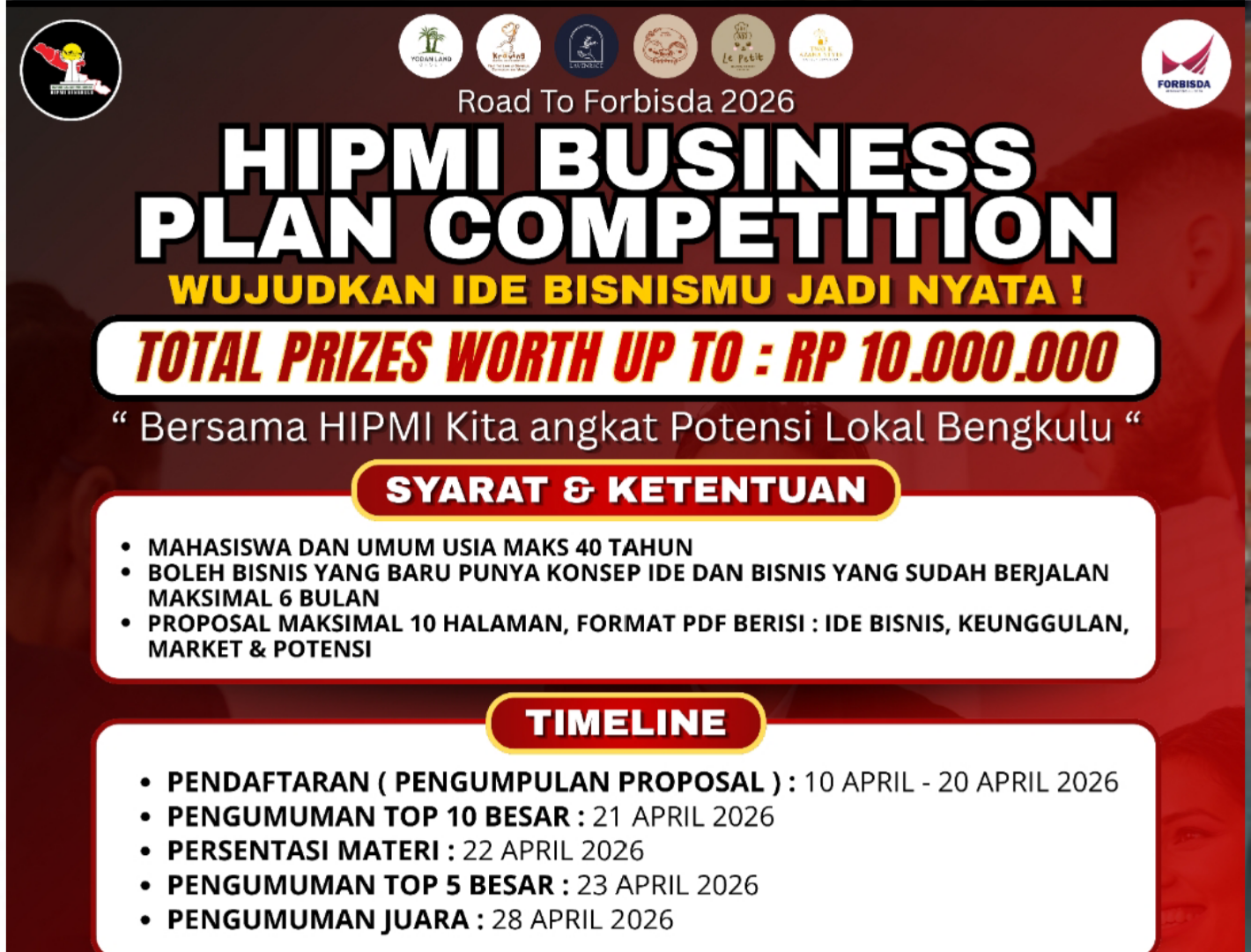 Realitapost.com, Bengkulu – Badan Pengurus Daerah Himpunan Pengusaha Muda Indonesia (BPD HIPMI) Provinsi Bengkulu resmi menggelar HIPMI Business Plan Competition 2026 sebagai bagian dari rangkaian Road to Forbisda 2026. Kegiatan ini menjadi wadah bagi generasi muda untuk mengembangkan ide bisnis kreatif dan inovatif.
