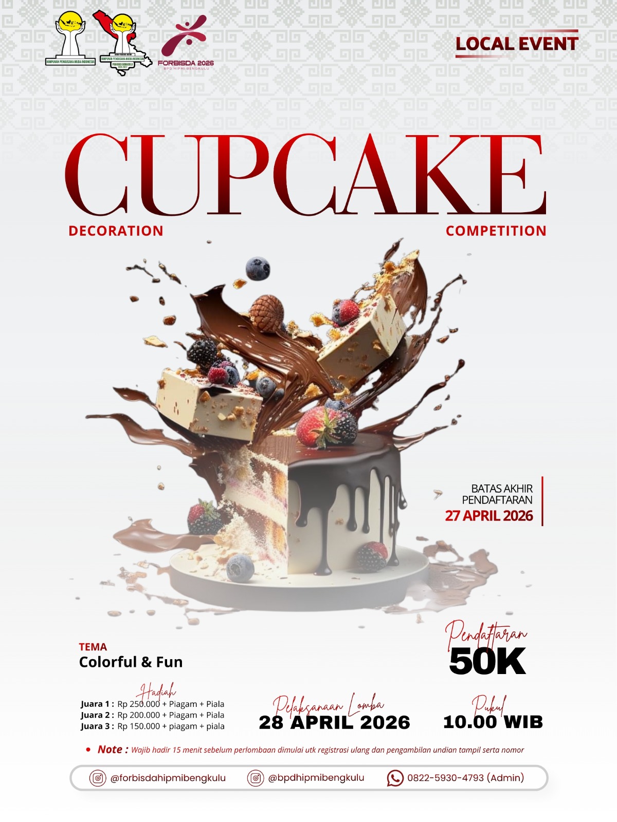 Realitapost.com, Bengkulu – Dalam rangka memeriahkan rangkaian kegiatan HIPMI Expo 2026, akan digelar lomba Cupcake Decoration Competition yang mengusung tema “Colorful & Fun”. Kegiatan ini menjadi salah satu ajang kreatif bagi masyarakat, khususnya generasi muda, untuk menyalurkan bakat di bidang seni dekorasi kue.
