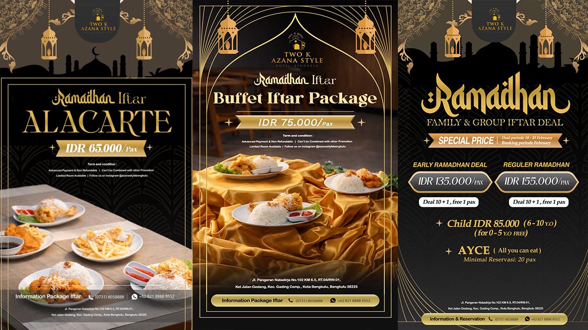 REALITAPOST.COM, BENGKULU – Menyambut bulan suci Ramadhan yang penuh berkah, Two K Azana Style Hotel Bengkulu kembali memanjakan masyarakat Bumi Rafflesia dengan berbagai penawaran menarik. Hotel yang berlokasi strategis di Jl. Pangeran Natadirja ini menghadirkan tiga kategori promo spesial untuk momen berbuka puasa yang berkesan bersama keluarga dan kolega.