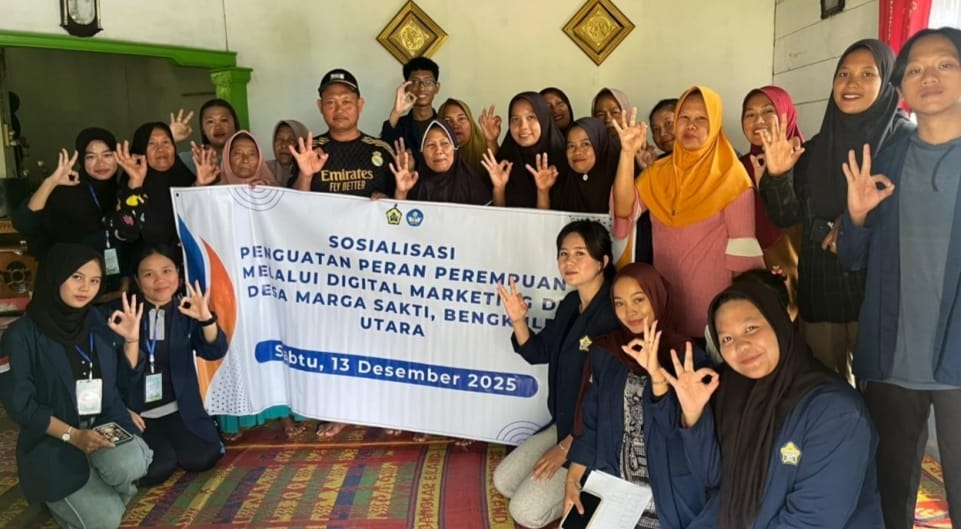 Desa Marga Sakti, Bengkulu Utara — Sebanyak 14 perempuan pelaku usaha rumah tangga mengikuti sosialisasi dan pelatihan digital marketing yang dilaksanakan oleh tim pengabdian Jurusan Sosiologi Universitas Bengkulu pada Sabtu, 13 Desember 2025, pukul 09.00–10.30 WIB. Kegiatan berlangsung di rumah Ketua Dusun 4, Bapak Darmanto, dengan format “learning by doing” yang memadukan paparan materi singkat, diskusi kelompok (FGD), serta praktik langsung pembuatan tautan WhatsApp/QR Code dan pembuatan konten promosi berbasis AI.