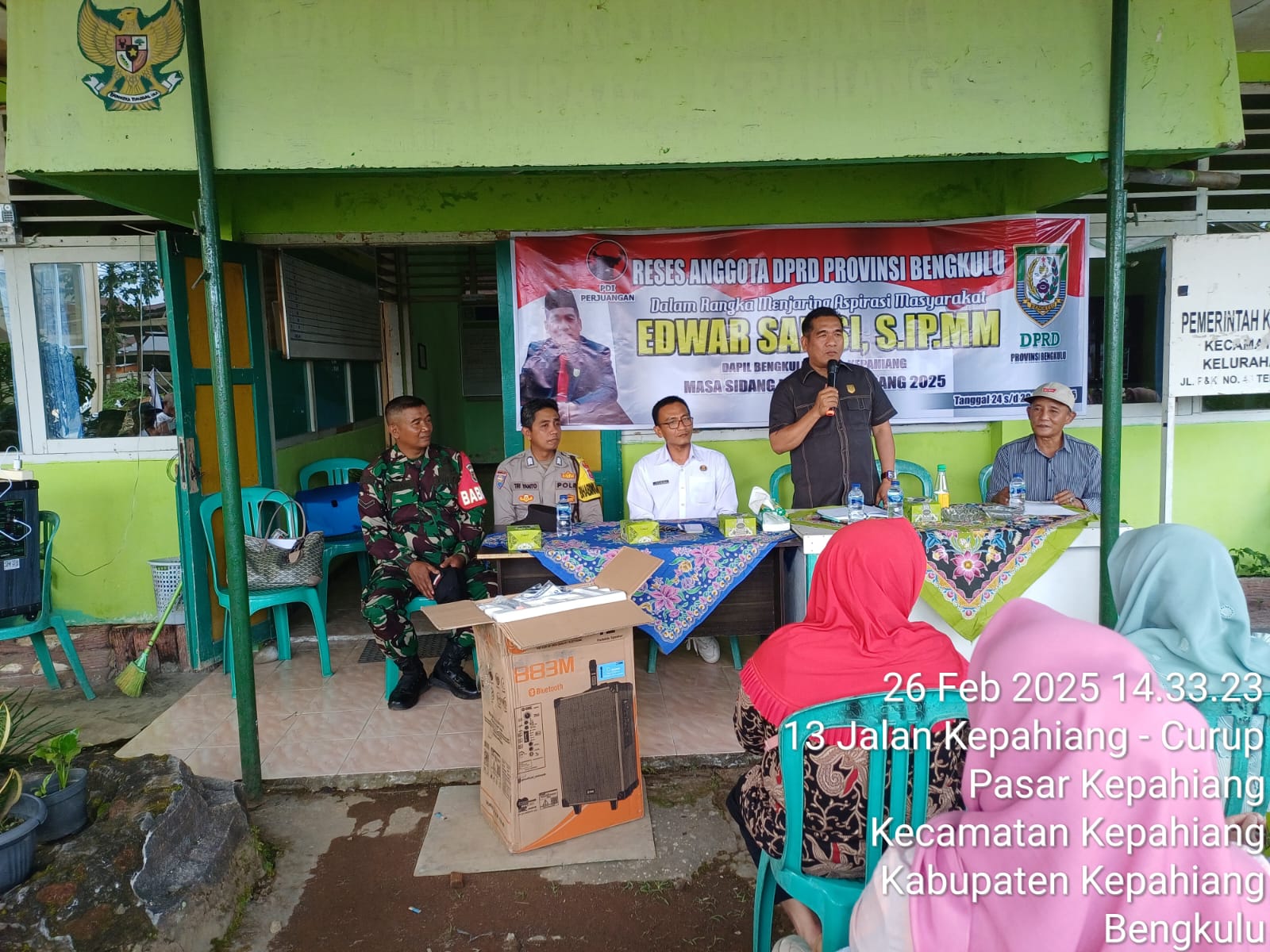 Bengkulu, Realitapost.com — Anggota Dewan Perwakilan Rakyat Daerah (DPRD) Provinsi Bengkulu, Edwar Samsi, SIP, MM, menggelar reses masa sidang pertama tahun 2025 yang dipusatkan beberapa titik di Daerah Pemilihan (DAPIL) yakni Hotel Umroh dan Kantor Kelurahan Cijantung Kabupaten Kepahiang mulai tanggal 24 hingga 28 Februari 2025.