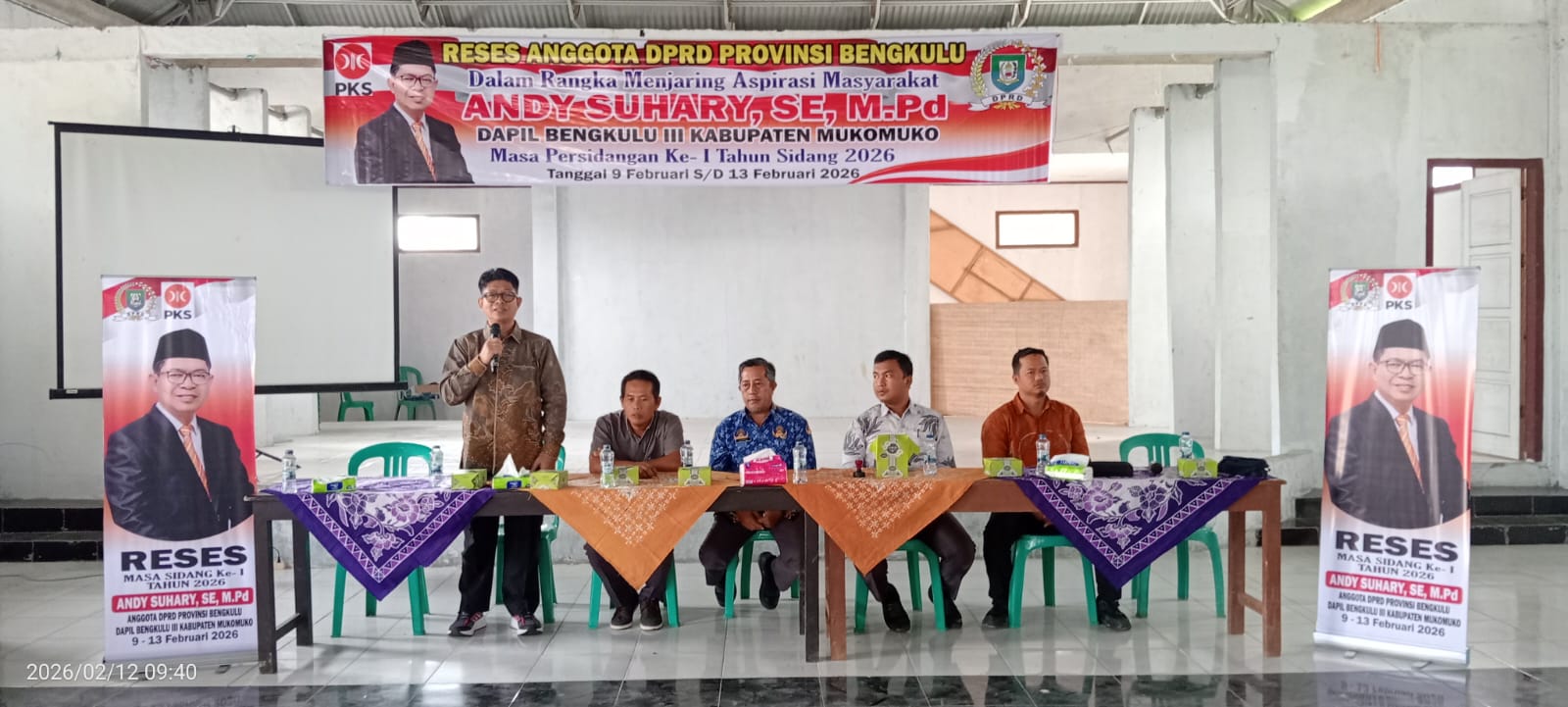 Realitapost.com, Mukomuko – Ketua Badan Kehormatan DPRD Provinsi Bengkulu, Andy Suhary, S.E., M.Pd., melaksanakan reses di Desa Sidomakmur, Kecamatan Air Majunto, Kamis (12/2/2026).